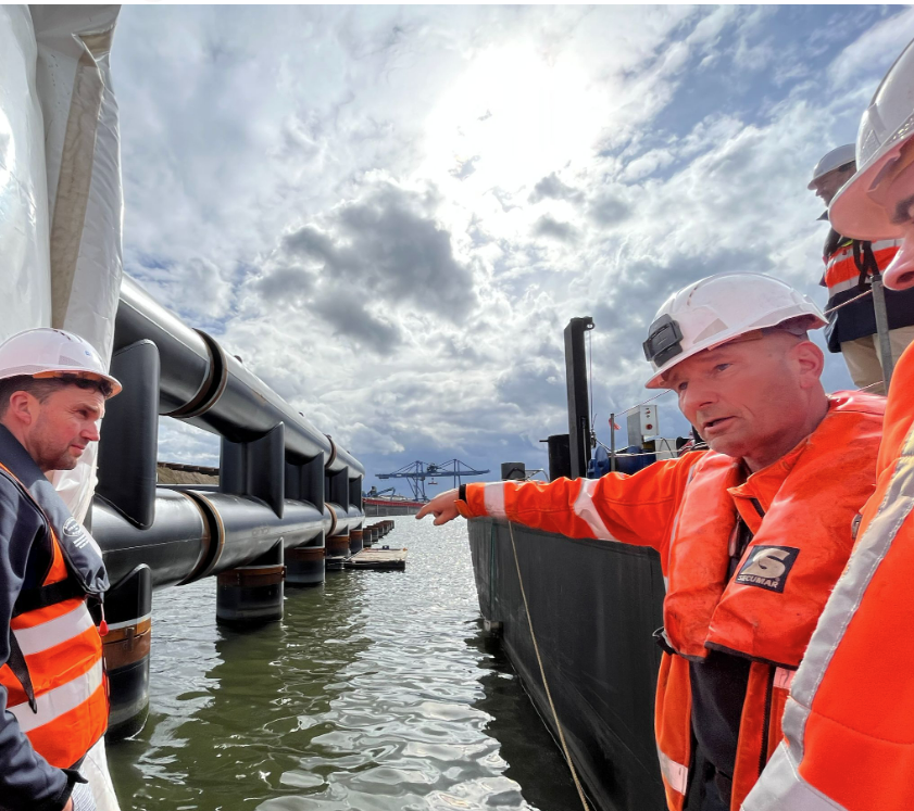 Richard Swanenberg, uitvoeder bij Van den Biggelaar Grond- en waterbouw heeft iedereen meegenomen het water op, om van dichtbij te laten zien hoe de aanvaardbeveiliging gemaakt wordt: van het straal- en coatingwerk in de drijvende lastenten tot een uitleg over het vijzelen van de buispalen. Ook gaf hij een toelichting over de verbreding van het heischip de Thomas en hoe met de extra gecreëerde stabiliteit te werk kon gaan tijdens het heien van de grote buispalen.